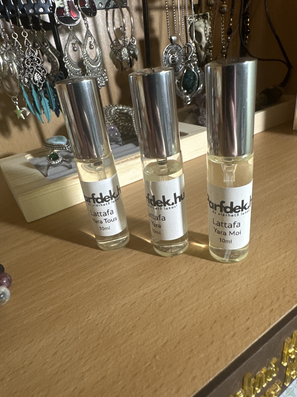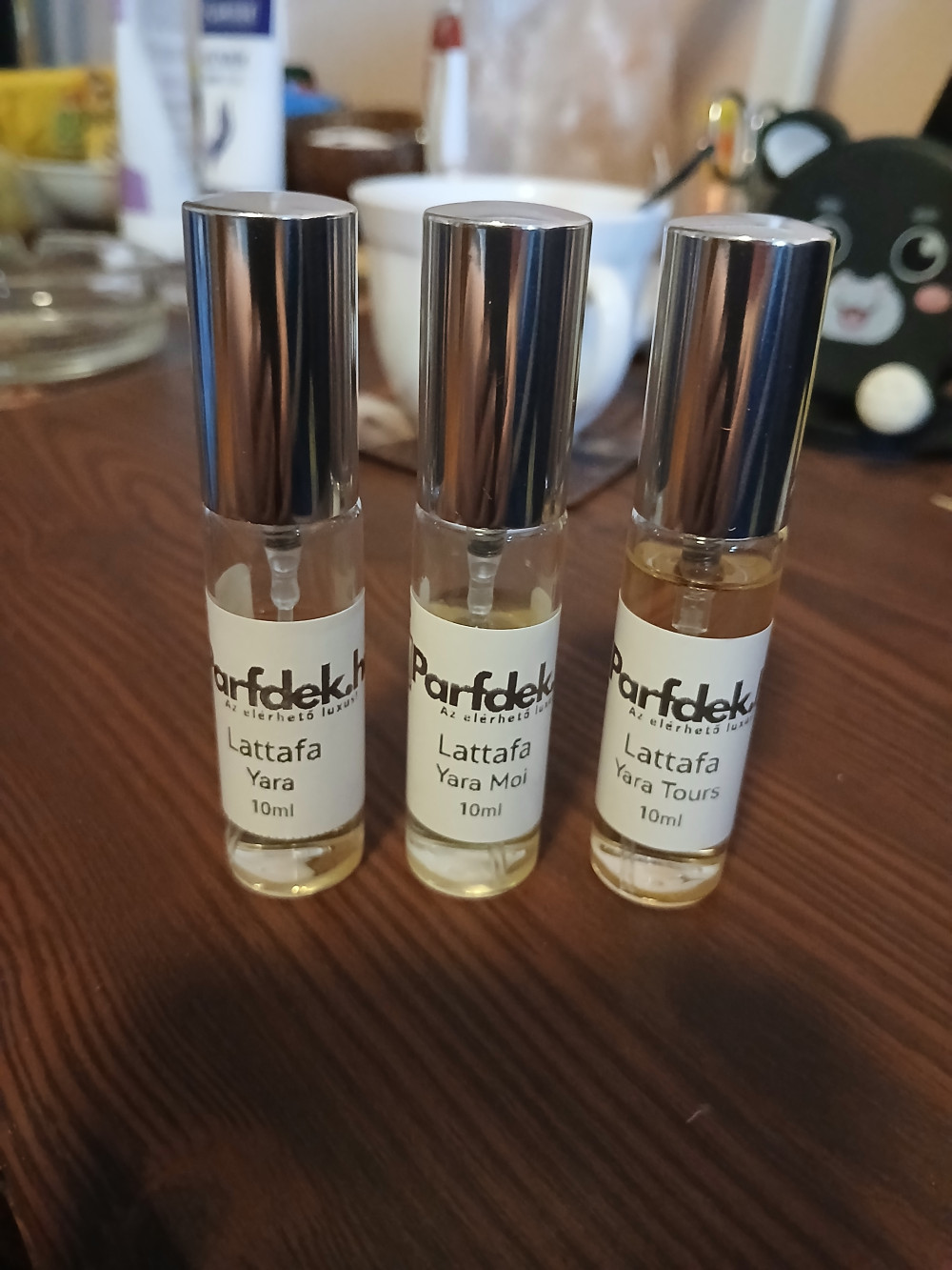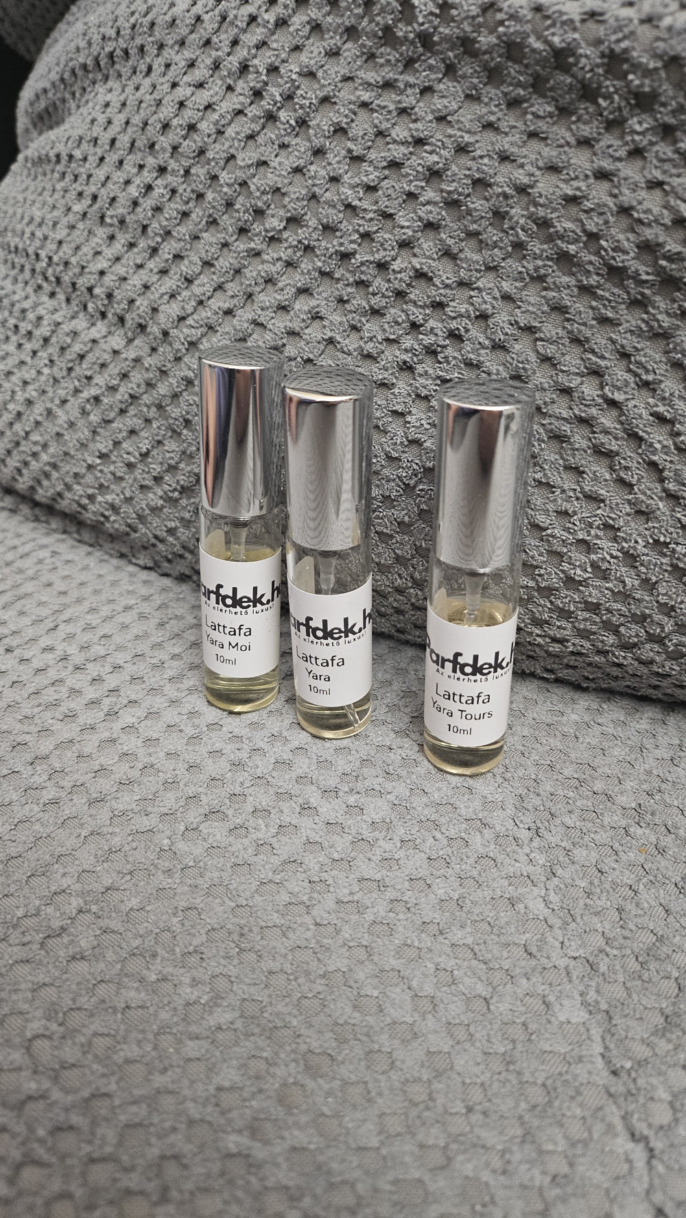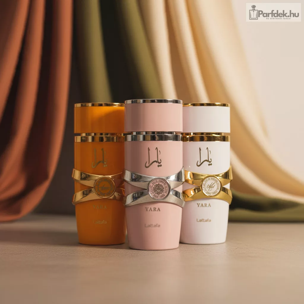 Lattafa Yara:A Yara egy fás-vanília illat nőknek. Az aromás kompozíció mandarinnal, heliotróppal és orchideával nyit. A szív tele van trópusi virágokkal. Vanília, szantálfa és pézsma fejezi be a kompozíciót.