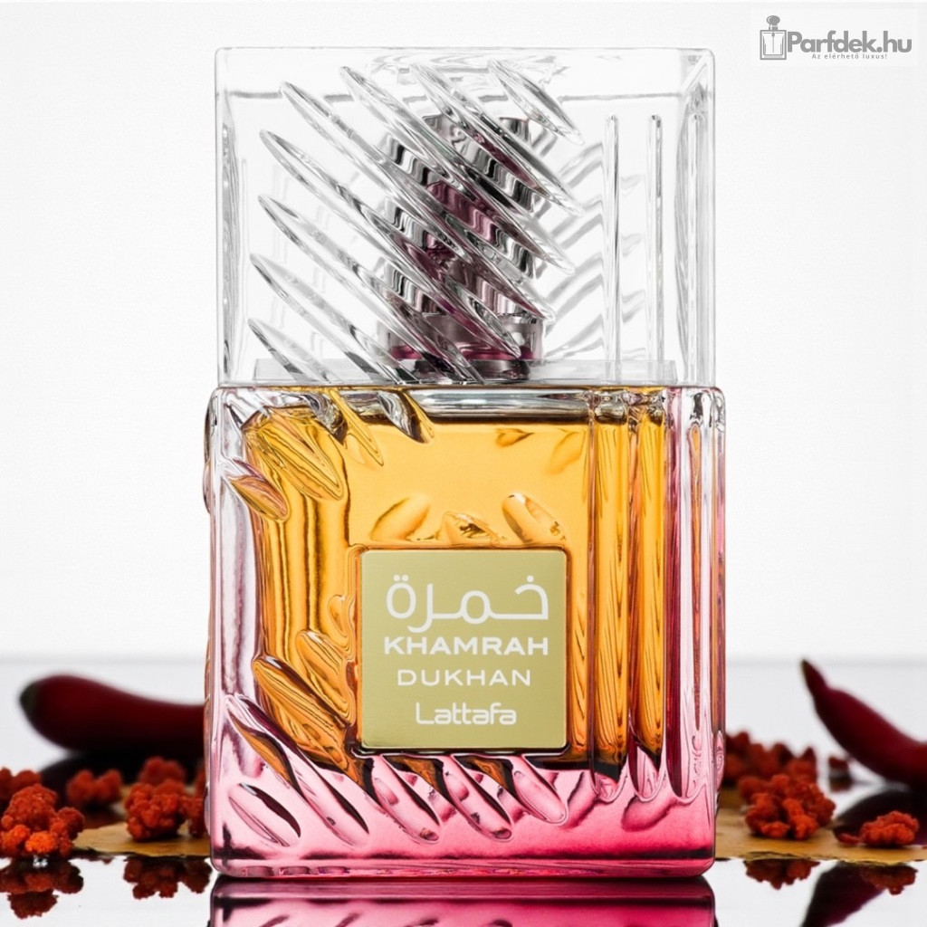 A Khamrah Dukhan a Lattafa Perfumes 2025-ben megjelent orientális illata. A „Dukhan” arab szó jelentése „füst”, amely tökéletesen tükrözi ezt az illatot: a Közel-Kelet ősi füstölési rituáléjának modern, illatbéli átirata. A kompozíció füstös-fűszeres nyitánya a pimentó, a fűszerek és a mandarin robbanékony elegyével indul, érzékeket ébresztve. A szívjegyekben gyantás labdanum, misztikus tömjén, földes pacsuli és bársonyos narancsvirág fonódik össze, tovább mélyítve a kompozíció karakterét. Az alapjegyekben dohány, tonkabab, borostyán, benzoin és édes praliné adnak hosszú, meleg lecsengést. A Khamrah Dukhan sötét, csábító és füstösen érzéki – egy erőt, eleganciát és vonzerőt sugárzó illat